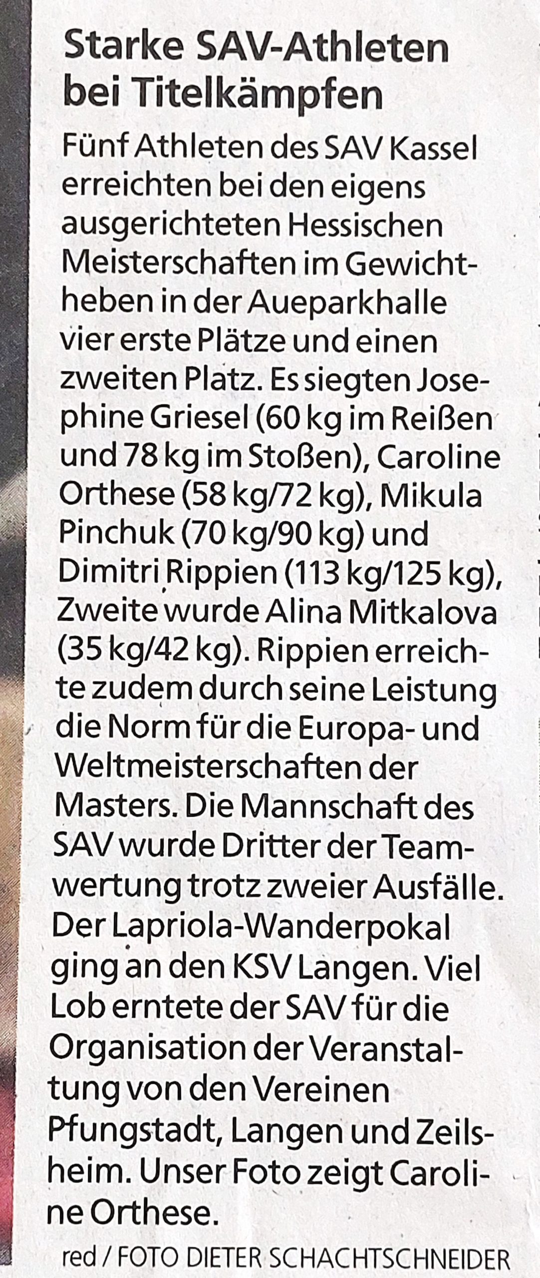 Am Samstag, den 6.9.25 führte die Gewichtheber Abteilung des SAV Kassel eine offene hessische Aktiven Meisterschaft in der Aue Park Sporthalle durch. Beginn war 11:30 Uhr mit dem Heben der Frauen